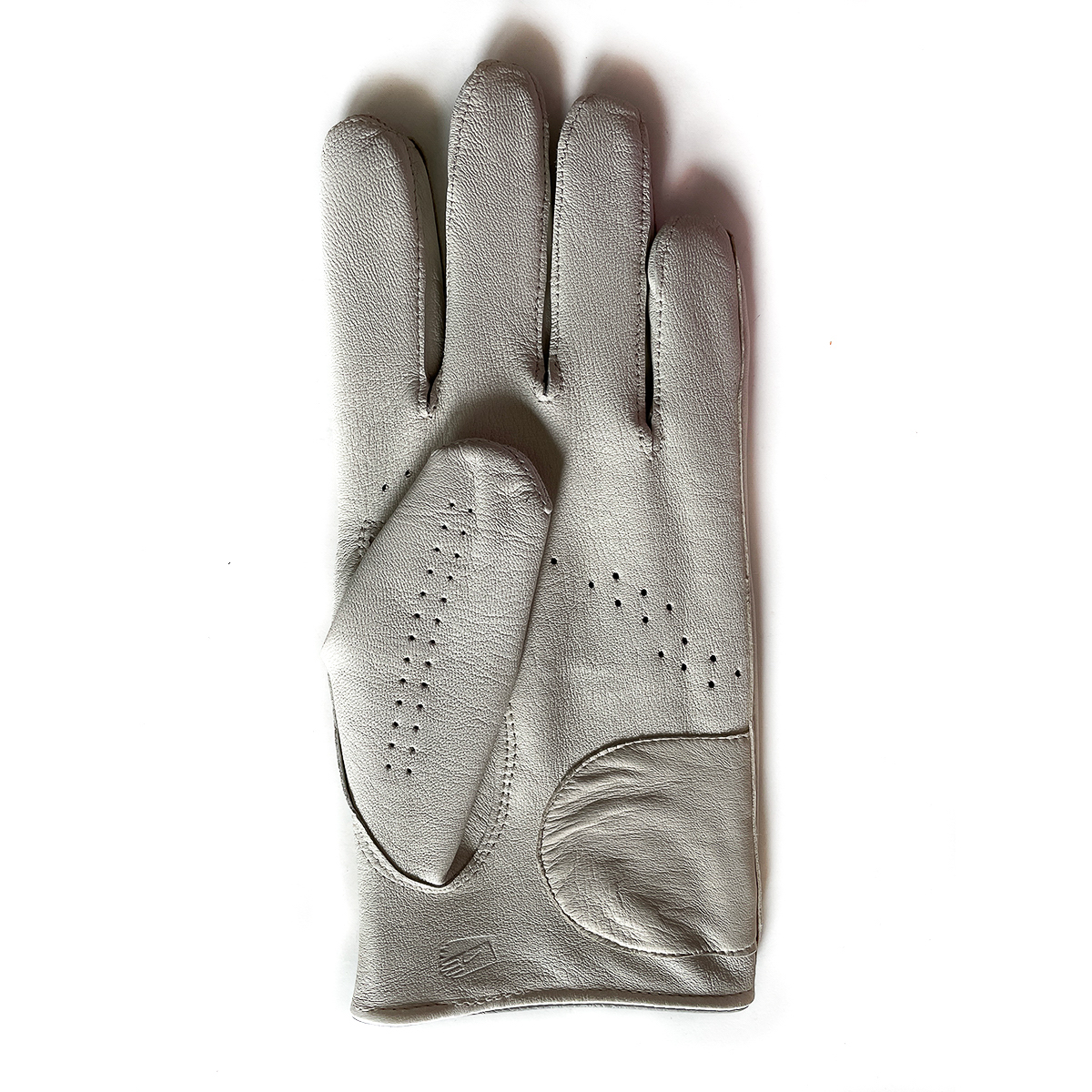 Letní pánská golfová rukavice v barvě slonové kosti a se šedou barvou lemování. Netradiční tvar této golfky podtrhuje nejen kontrast barev, ale také výstuha na bříšku dlaně, která zlepšuje úchop golfové hole. Hřbet rukavice je opatřen jemným výkrojem spojeným malým drukem. Oblíbená klasika ve formě letního modelu. Do objednávky prosím uveďte LEVÁ nebo PRAVÁ.