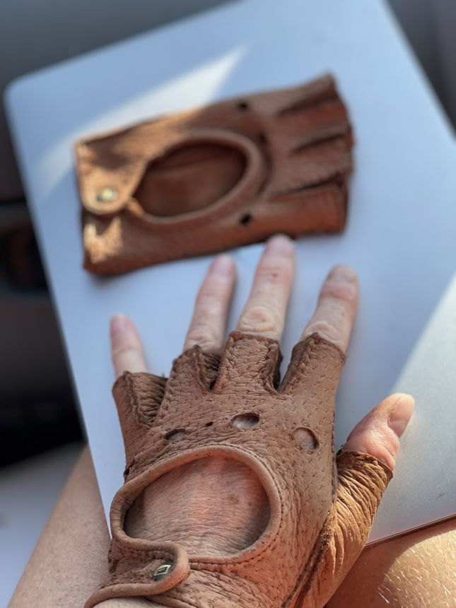 Dámské bezprstové rukavice, vhodné nejen pro řízení auta, ale také pro oživení vašeho každodenního outfitu. Rukavice mají malý výkroj na hřbetu ruky a jsou celistvě spojené jemným drukem. Kompletně ručně šité včetně olemování stehem Royal.