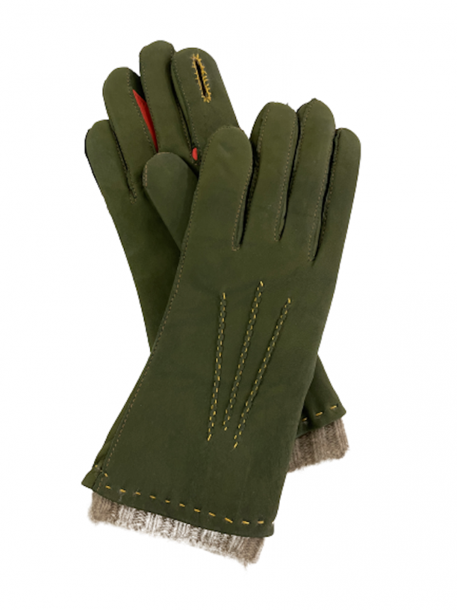Dámské kožené rukavice s otvorem pro vystrčení ukazováku určitě ocení nejen dámy "nimrodky" na honech. Vyrobeny z olive zeleného nubucku. Konstrastní corneline oranžová barva je použita na meziprstí, ruční prošití na hřbetu rukavice a obšití otvoru pro vystrčení prstu. V této rukavici můžete pohodlně ovládat spoušť na zbrani nebo používat dotykovou obrazovku na telefonu. Zápěstí je zakončeno jemným hřejivým lemem z kašmírové podšívky a je ručně prošito.