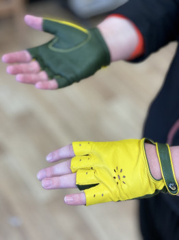Letní kombinace barev jasně žluté s olivově zelenou barvou jehnětiny. Bezprstové dámské rukavice. Pásek je olemován. Hřbet je mírně otevřený s perforací květiny. Vyberte si svou variaci barev dle Vašeho nacítění. Nebo zůstaňte tón v tónu. Mladistvý vzhled modelu nejen pro slečny.