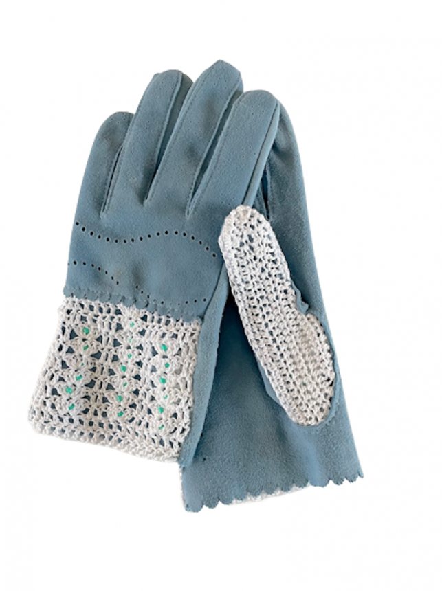 Kombinace světlé modrého nubucku s bílou ručně háčkovanou krajkou se zelenými drobnými korálky. Krátší zápěstí lehce pod palec ruky 3cm.