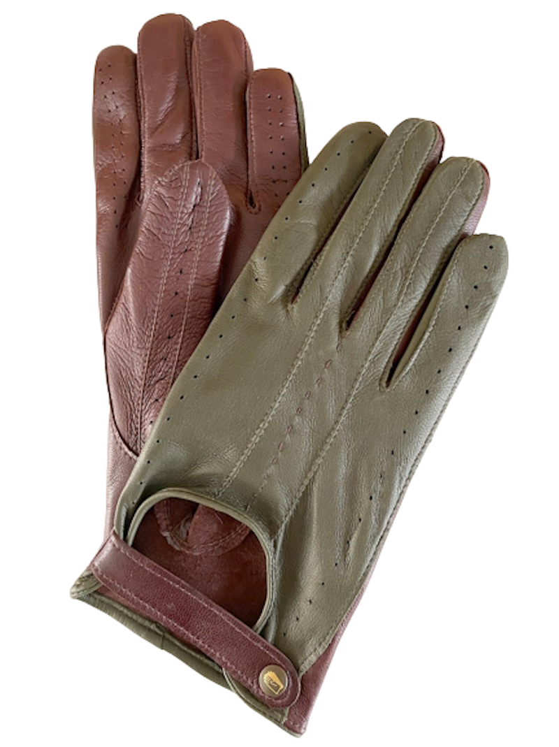 Kombinace barev olivově zelené na hřbetru rukavice s tmavým koňakem v dlani. Malý otvor na rukavici s jemnými perforacemi a výšivkou posunuje model do úrovně netradiční klasiky. Ruce muže mohou být oblečeny i do netreadičního stylu rukavic. Jsou bezpodšívkové. Barevnou kombinaci si můžete navolit sami, nebo zůstat u jednobarevného provedení tón v tónu. Lze kombinovat hladkou stranu kůže s obrácenou velurovou stranou. Fantazii se meze nekladou.