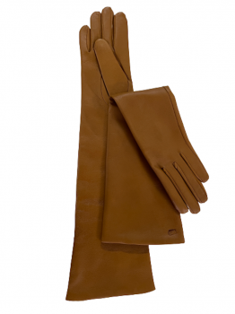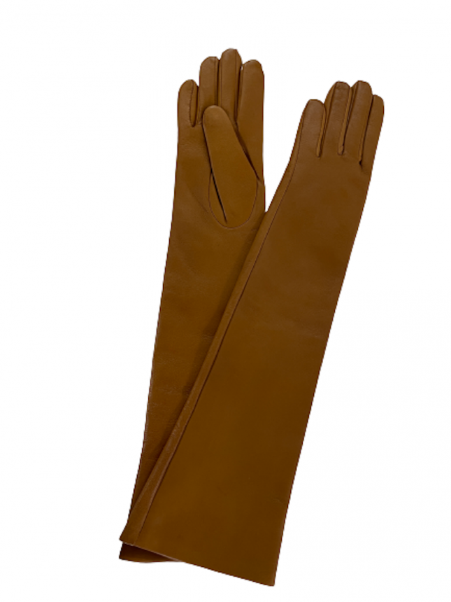 Dámské kožené rukavice nad loket v barve oříškově hnědé. Uvnitř je zlatavé čisté hedvábí.