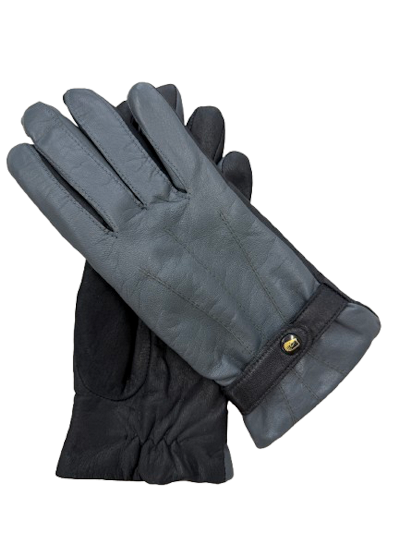 Sportovně laděný model v kombinaci barev šedé a černé jehnětiny. Rukavice jistí pásek s drukem na hřbetu, v zápěstí rukavice je gumička. Délka rukavice k zápěstí.