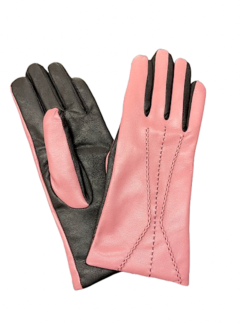 Dámské zimní kožené rukavice s kašmírem , v kombinaci barev old pink pudrová s černou jehnětinou "crash" look. Hřbet zdobí ruční výšivka kontra vyšitá.