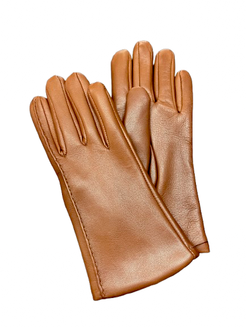 Dámské zimní kožené rukavice s kašmírem v koňakové barvě. Jednoduchá ruční ozdoba v ukazovákové části hřbetu ruky.