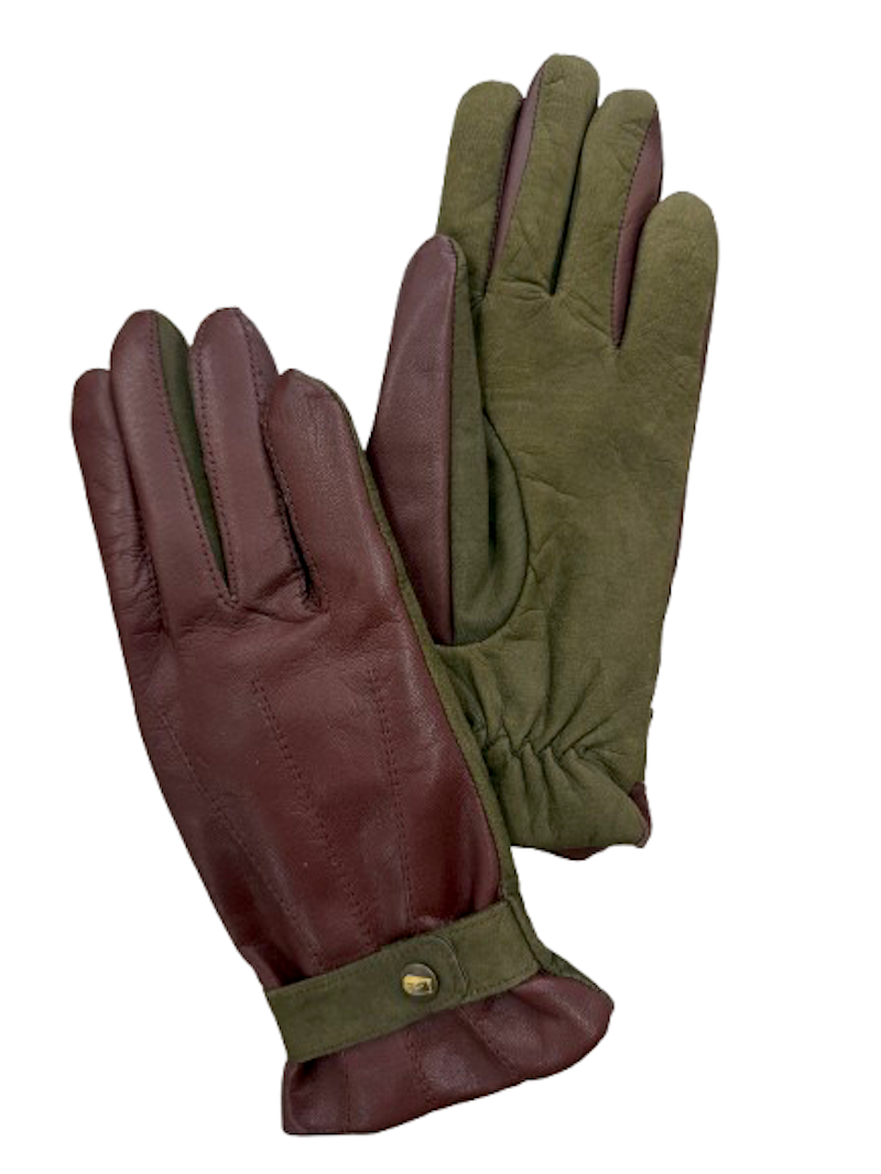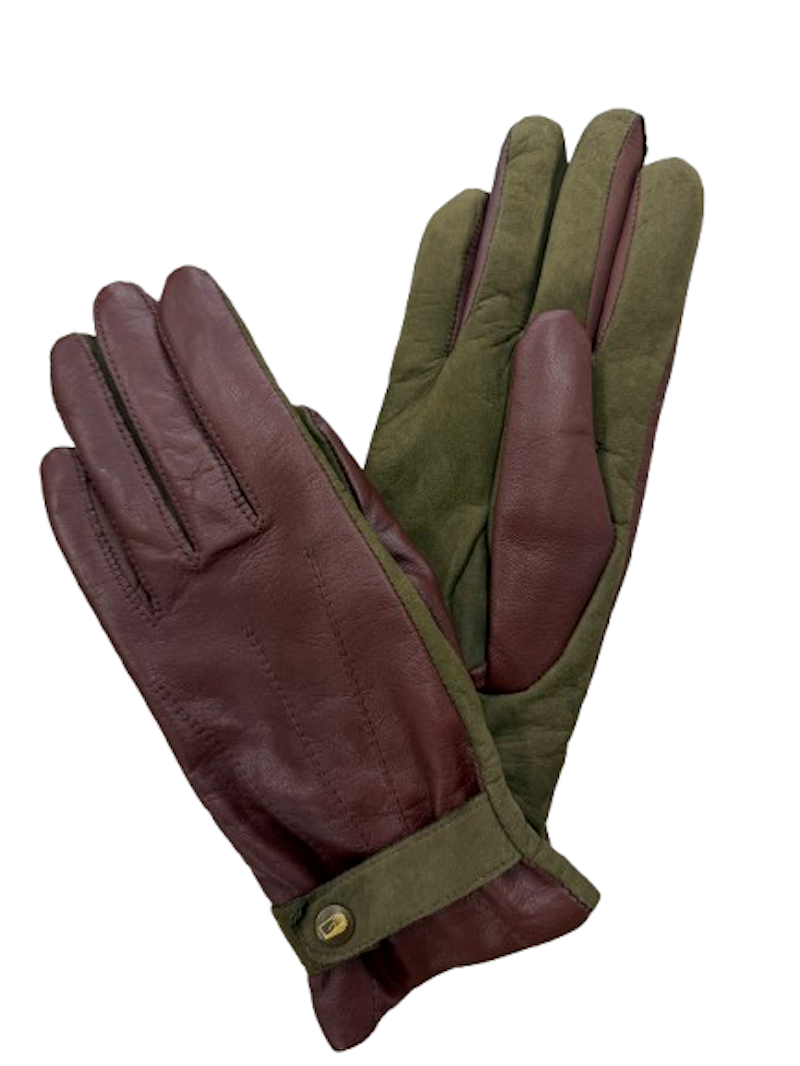 Sportovně laděný model v kombinaci barev hnědé jehnetiny s olive nubuckem. Rukavice jistí pásek s drukem na hřbetu, v zápěstí rukavice je gumička. Délka rukavice k zápěstí.