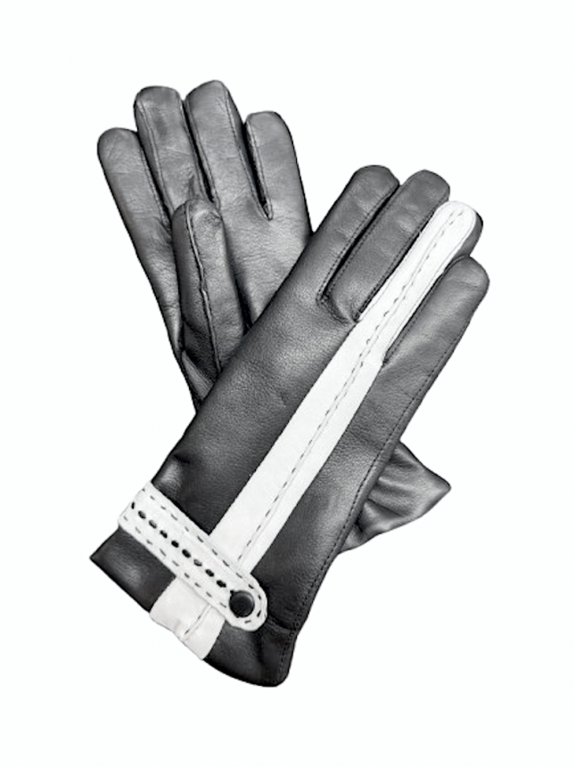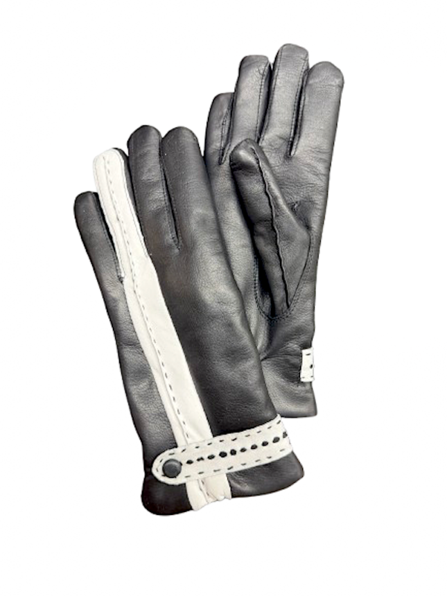 Elegantní model černá v černé. Propracovaný ozdobný pásek ukončený potaženým knoflíčkem podtrhuje výjimečnost těchto rukavic. Jemné prošití zdobí celou délku prsteníčku až k zápěstí rukavice. Stažení na ruku umožňuje gumička v dlani. Strojní šití.