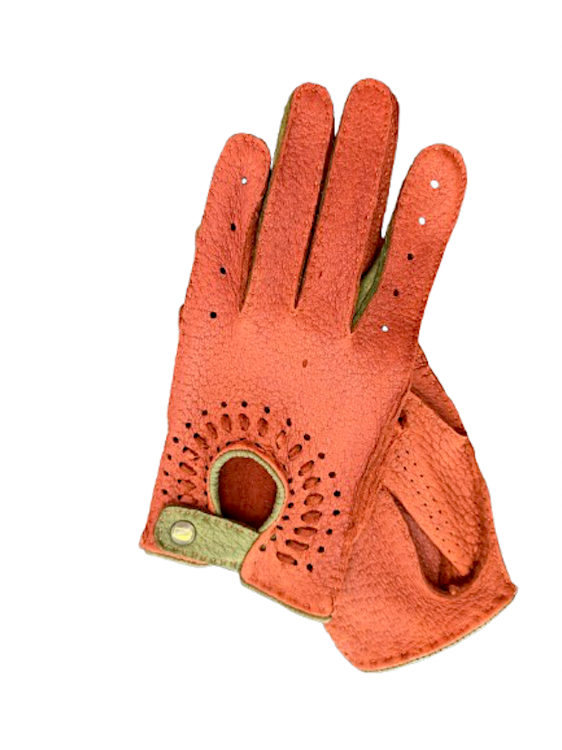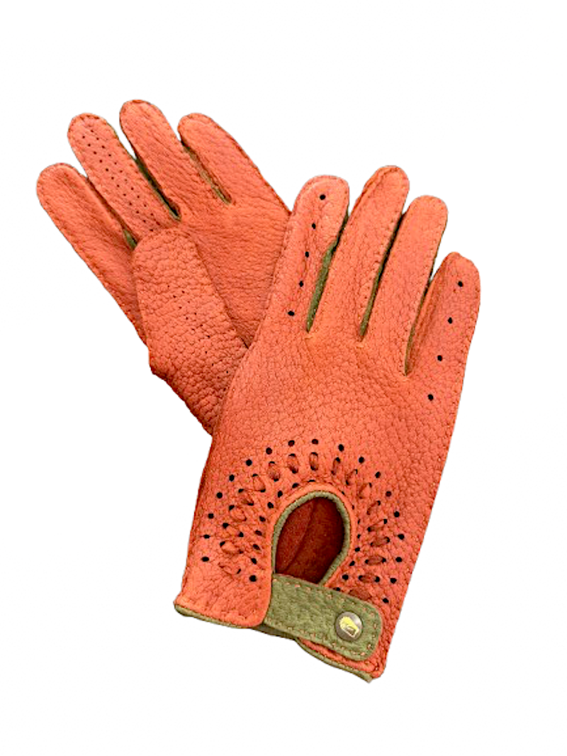 Ušlechtilé luxusní Peccary dámské rukavice v klasickém modelu šoférky, obohaceny o průplety ze stejného materiálu, ale z rubové části. Na hřbetu rukavice je ručně prošitý jemný pásek, perforace zajištuje prodyšnost modelu. Ručně šité.
