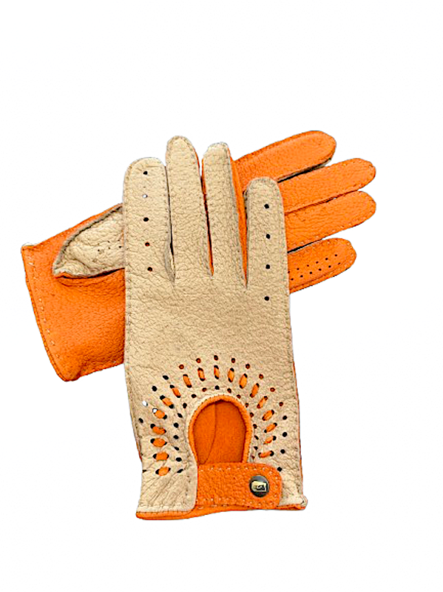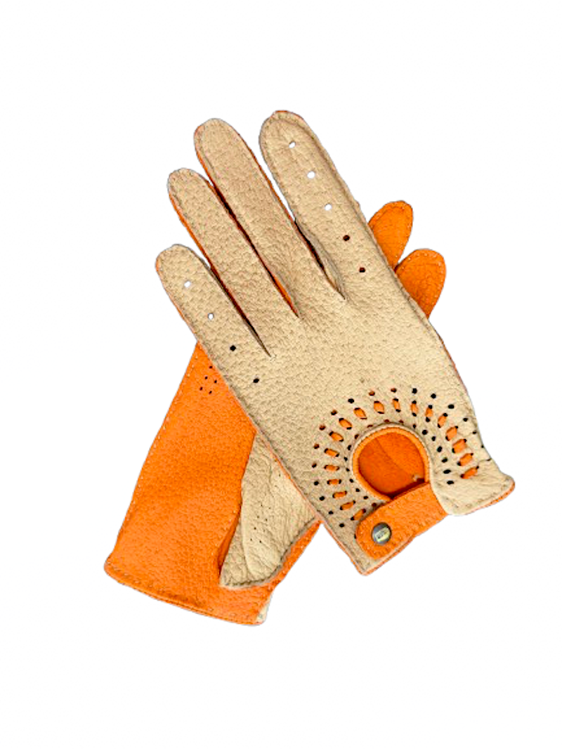 Ušlechtilé luxusní Peccary dámské rukavice v klasickém modelu šoférky, obohaceny o průplety ze stejného materiálu, ale z rubové části. Na hřbetu rukavice je ručně prošitý jemný pásek, perforace zajištuje prodyšnost modelu. Ručně šité.