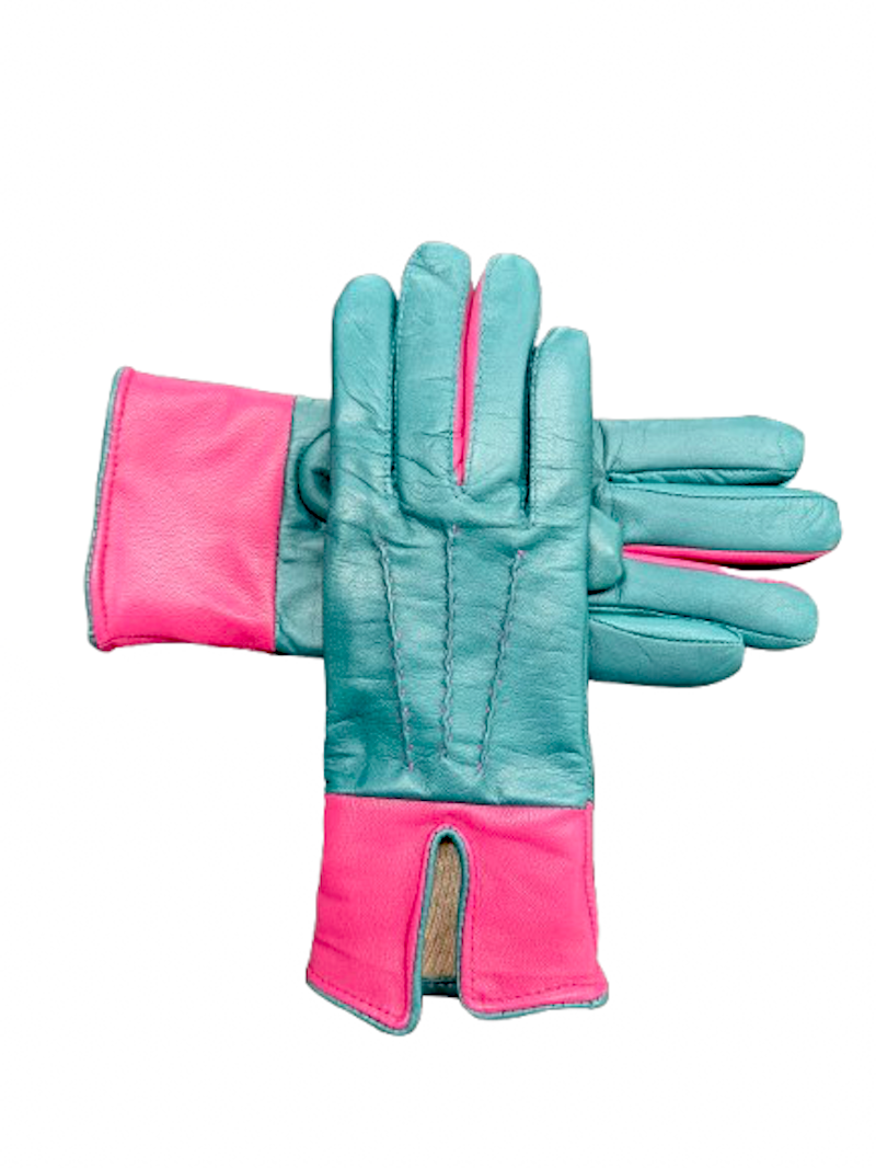 Hravá kombinace jehnětiny v tyrkysové barvě s růzovou magenta,podšívka vlna, rozparek na hřbetu ruky s českou výšivkou.