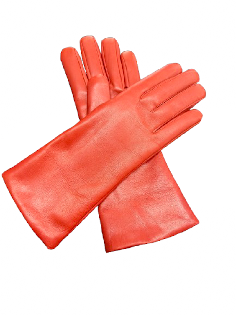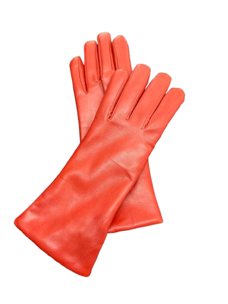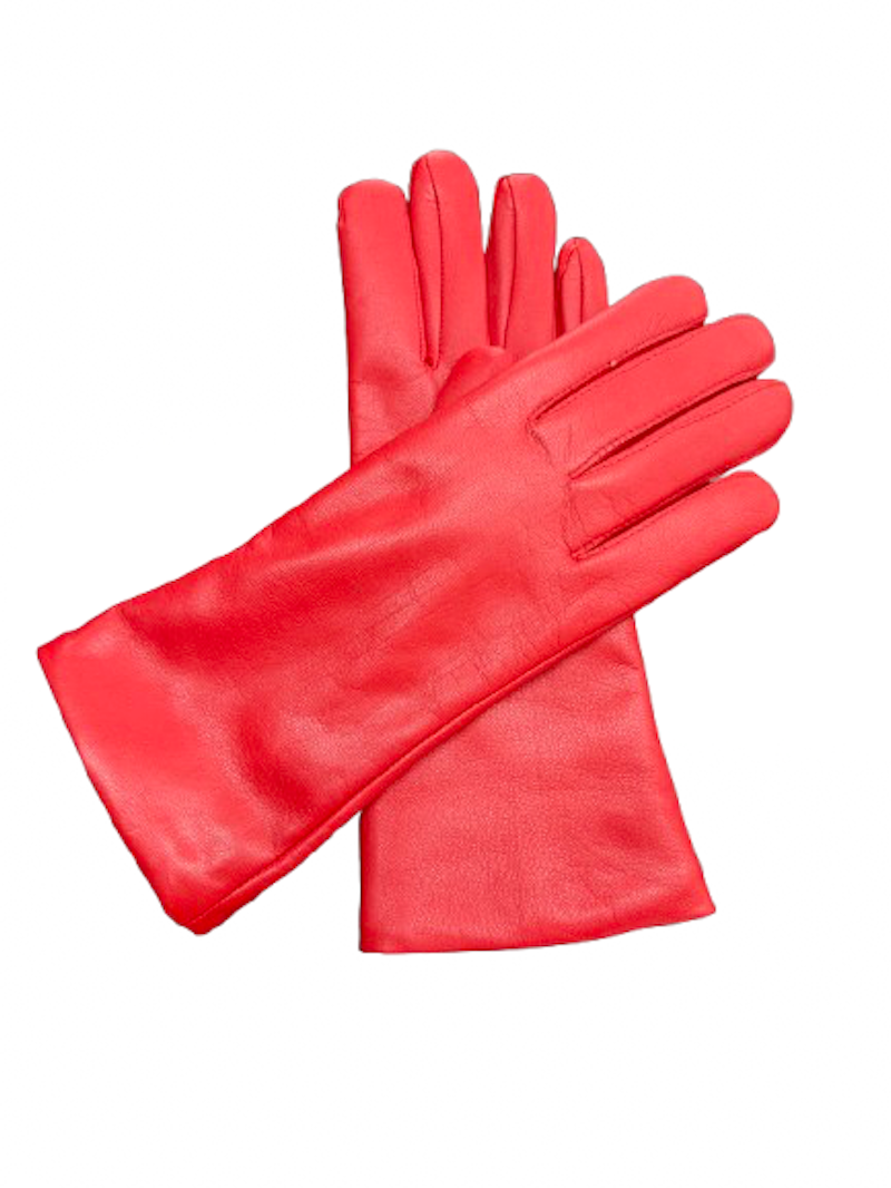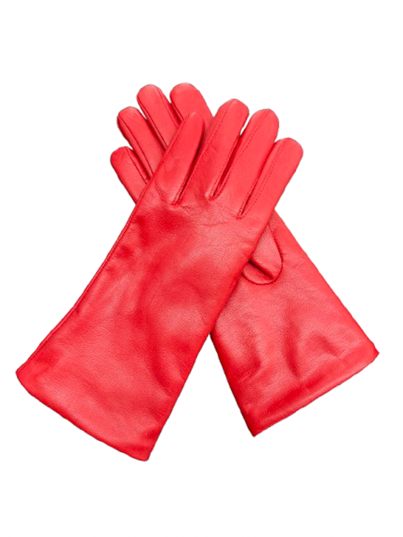 Dámské kožené zimní rukavice jasně červené Ferrari barvy, bez ozdob hladké, nad zápěstí délky.