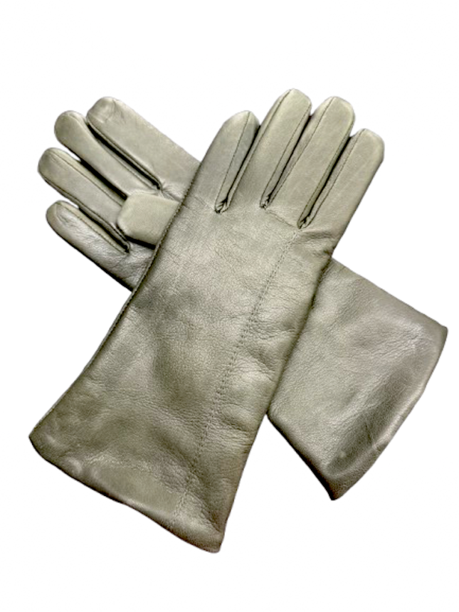 Dámské kožené zimní rukavice s kašmírem olivové barvy s decentním prošitím na hřbetu ruky.
