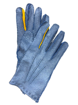 Vyrobeny jsou z Peccary , marine blue barvy prošité uni nití, rozparek v dlani , zdobení českou ruční šnůrkou. Krátké k zápěstí ruky. Ukarovák je spetřen všitou vložkou ze zlatavé peccary usně. POZOR delší prty.