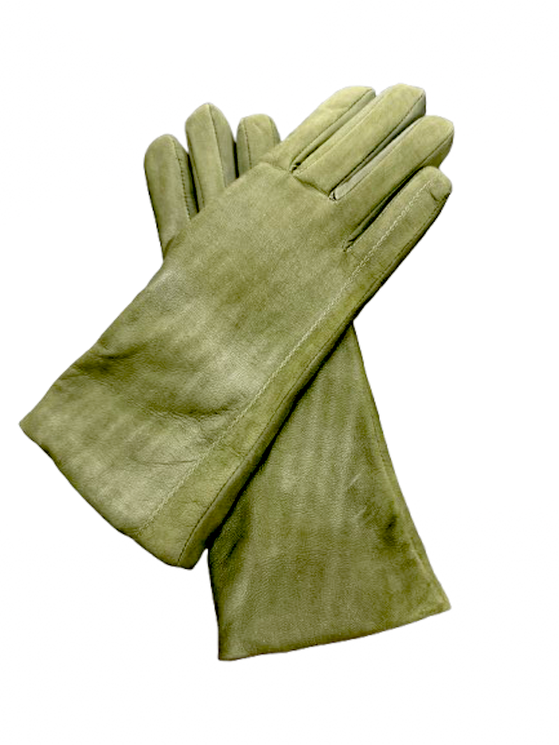 Dámské zimní kožené rukavice s kašmírem. Jemně zdobené strojním prošitím. Barva extra jemná kozlečinka v olivové barvě.