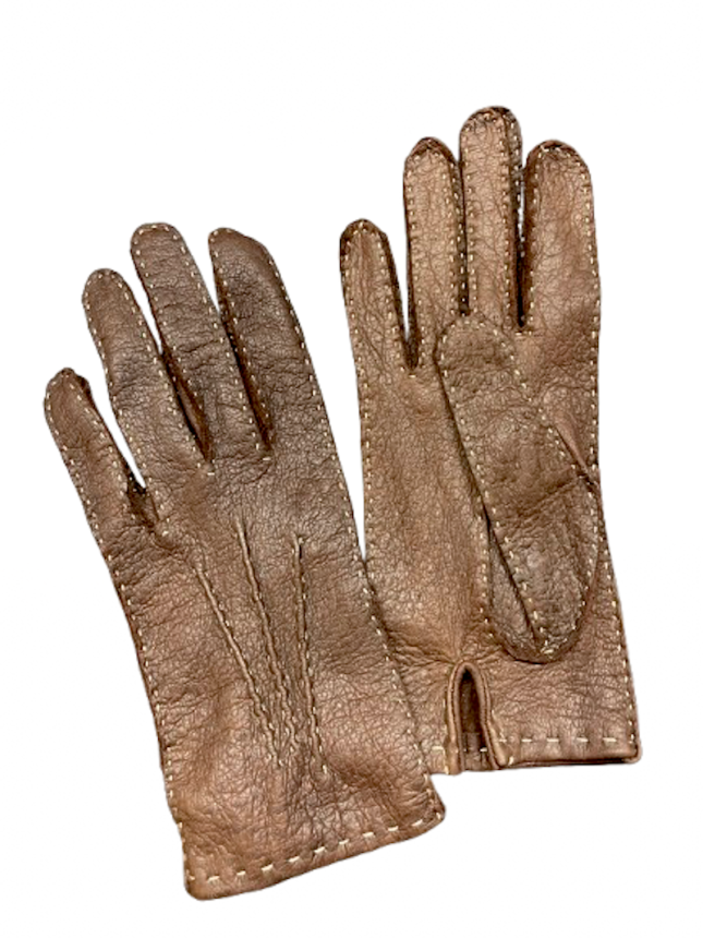 Vyrobeny jsou z Peccary, marron barvy prošité kontra nití béžové barvy, rozparek v dlani, zdobení českou ruční šnůrkou. Krátké k zápěstí ruky.