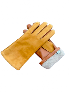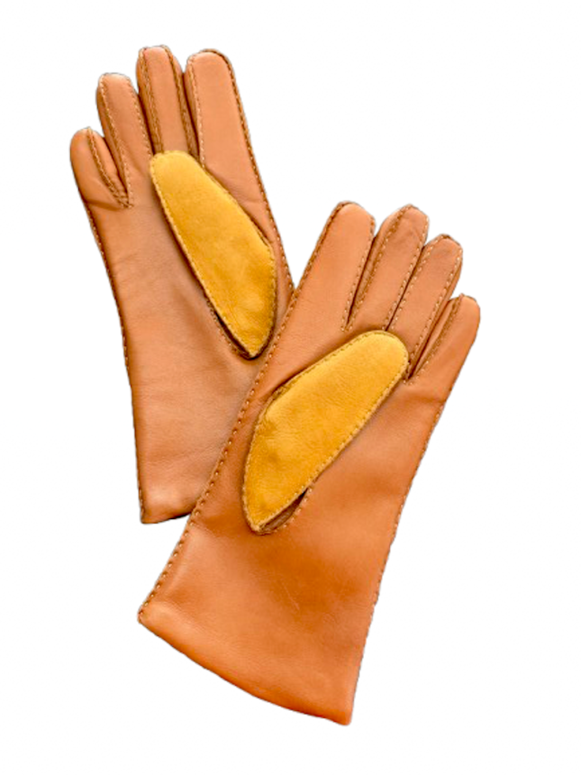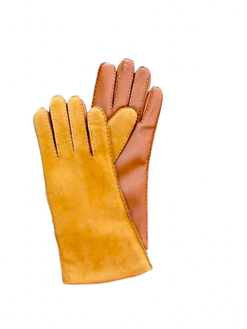 Limitovaná kolekce kombinací barev a materiálů. Tento model má hřbet z nubucku medové barvy a dlaň z jehnětiny v koňakové barvě.