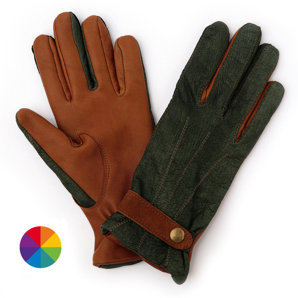 Sportovně laděný model v kombinaci barev koňak a green olive se stone efektem úpravy lícu kůže na hřbetu rukavice. Barevně laděné meziprstí u ukazováku rukavici posouvá na výjimečnou úroveň. Rukavice jistí pásek s drukem, v zápěstí je gumička. Barevnost můžete zvolit dle sebe, uveďte do poznámky k objednávce. Kontra či uni barvy. Strojně šité.