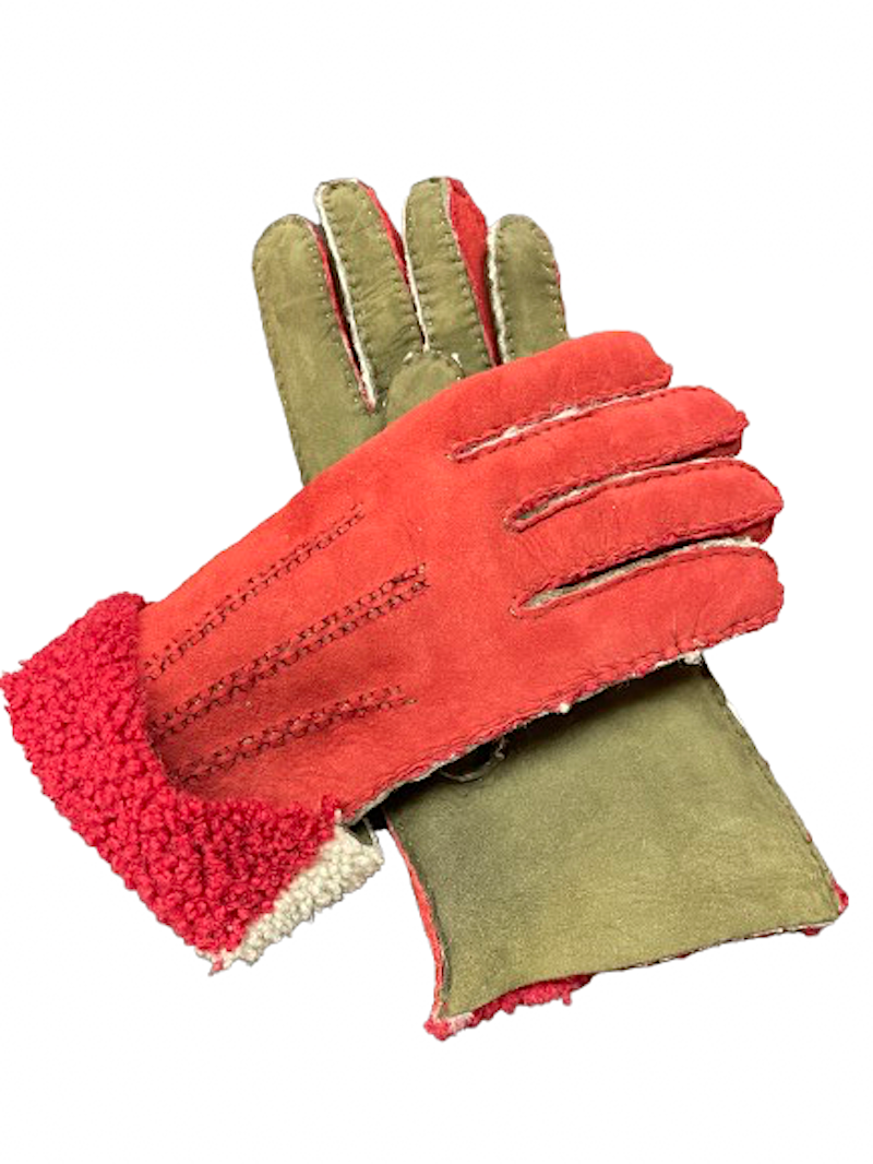 Kombinace barev olive a červená šmašle ručně šité kožešinové rukavice, s ozdobou na hřbetu rukavice.