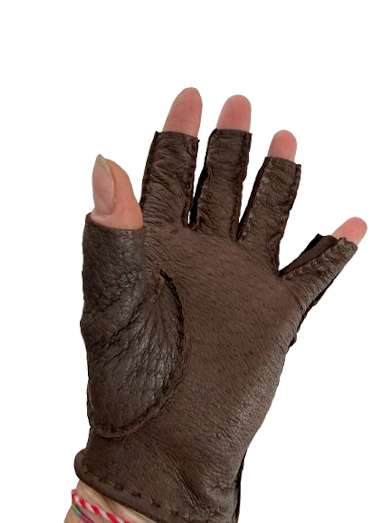 Ručně šité , čokoládové hnědé peccary. BEZPRSTOVÉ - jen horní článek prstů.