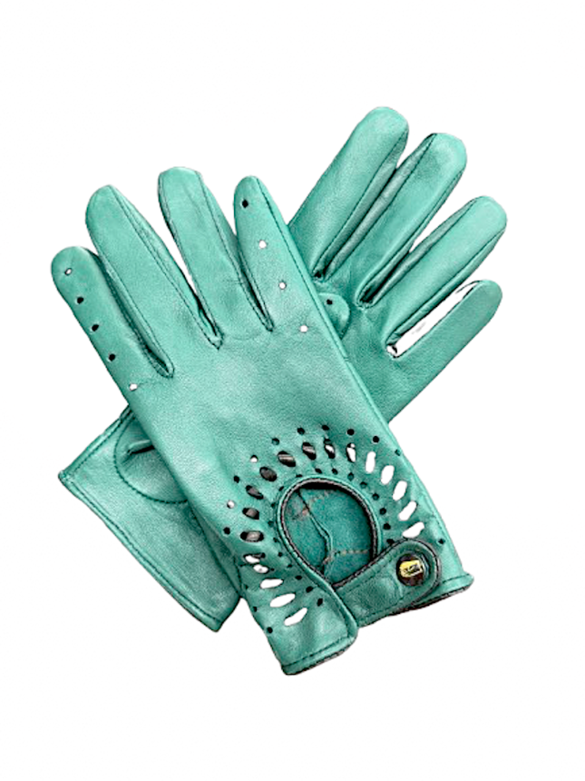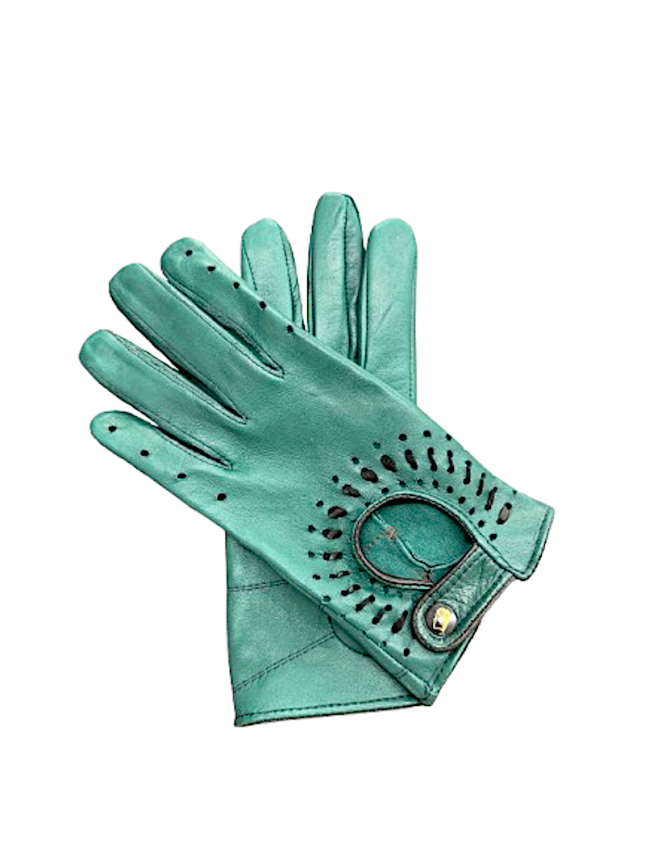 Dámské bezpodšívkové rukavice v petrolejově zelené barvě s černou kombinací v detailech. Jarní rukavice nejen do auta.
