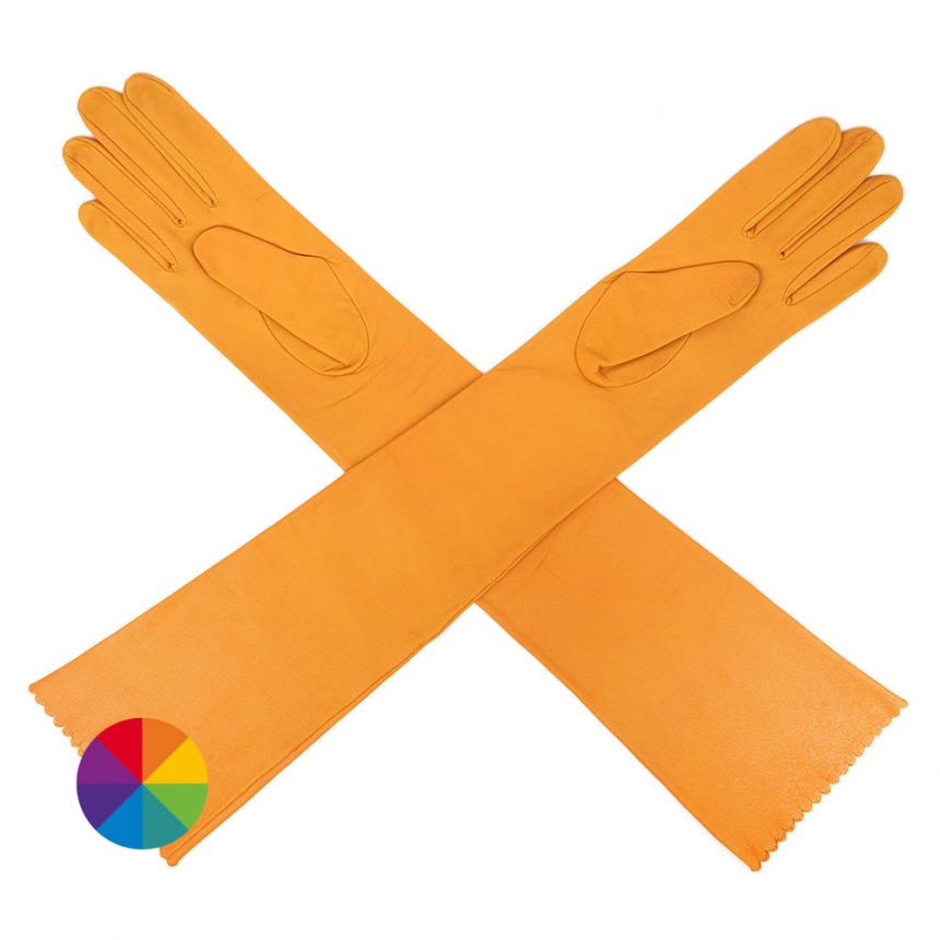 Klasické dámské rukavice v provedení lehce nad loket ruky, bez ozdob v celé délce, jen okraj je zdoben jemnou perforací vlnky, bezpodšívkové. Strojní šití.